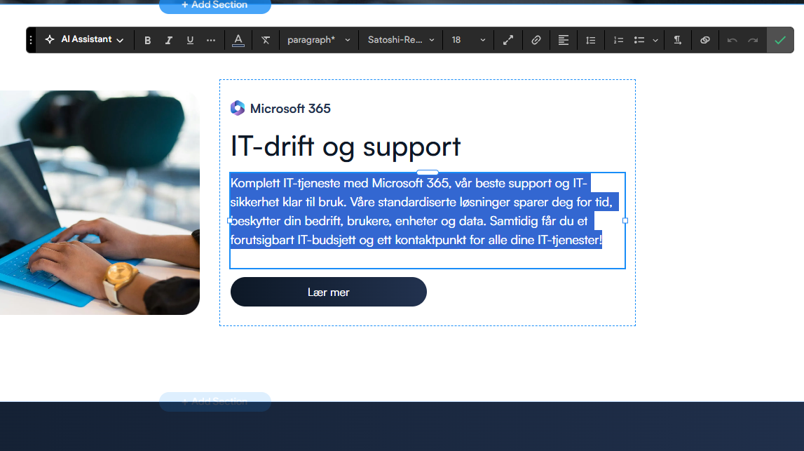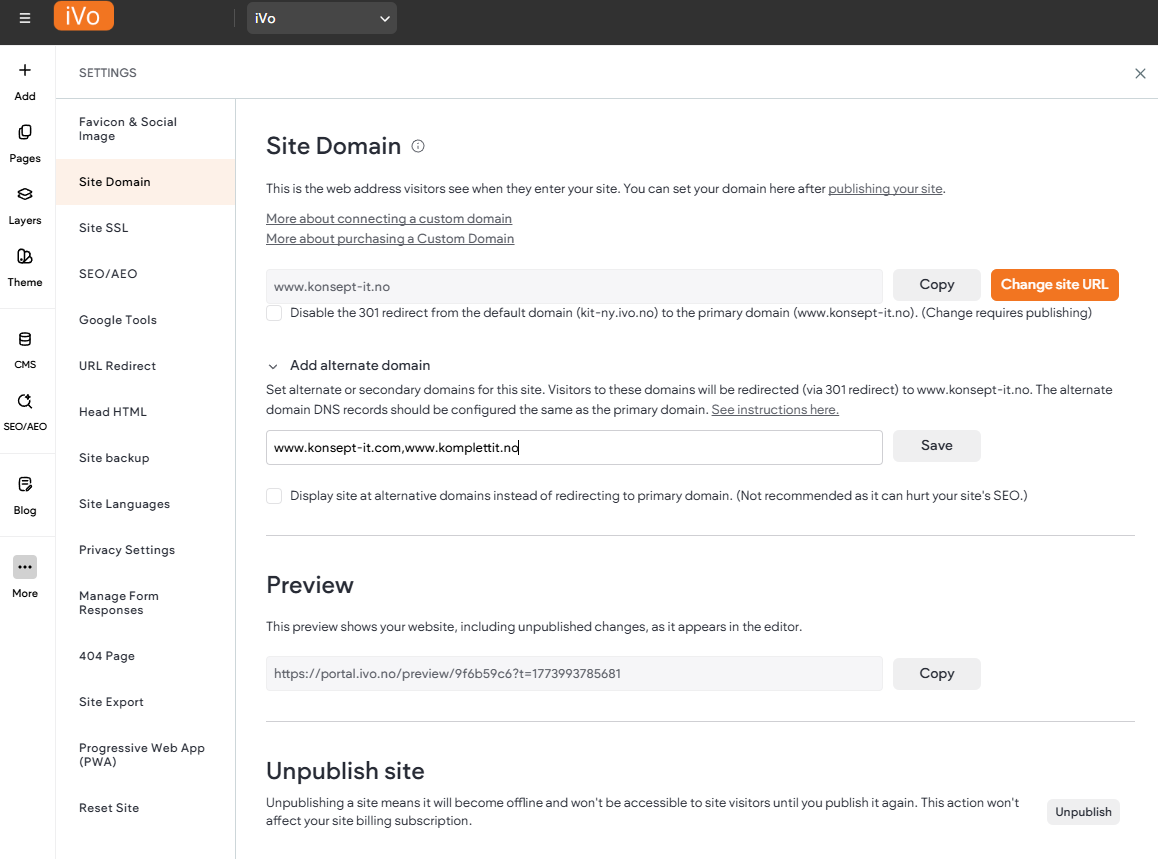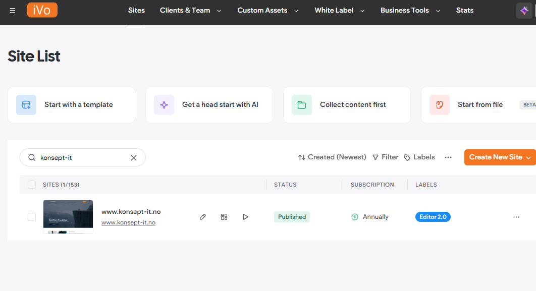 iVo er Konsept‑ITs nettsidebygger og publiseringsløsning, basert på Duda. Her kan du enkelt redigere tekst, bilder, seksjoner og funksjoner direkte i nettleseren, og publisere endringer når du ønsker. Nettsidene er raske, moderne og automatisk tilpasset alle skjermstørrelser.