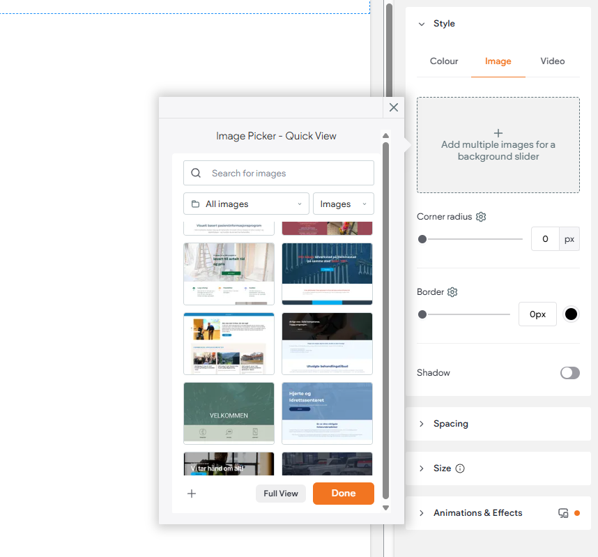 Last opp nytt bilde eller velg fra bildebiblioteket. Søk på engelsk gi best resultat i bildedatabasen. Bilder skaleres og optimaliseres automatisk. - Trykk en gang på bildet (ikke teksten eller annet innhold), så vil det dukke opp meny med innstillinger på høyre side. Utvid fanen "Style" og trykk på underfanen "Image".