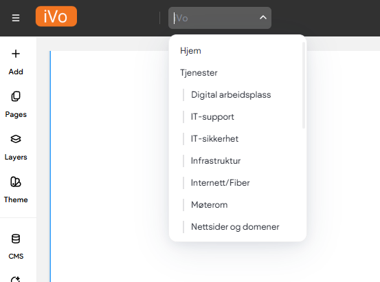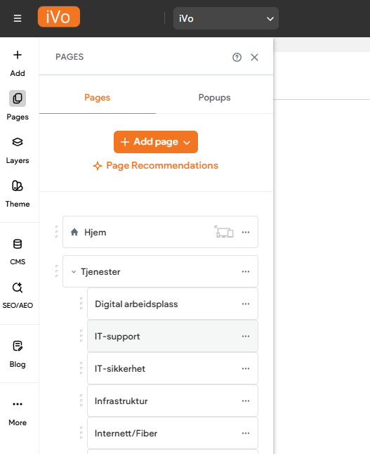 Herfra kan du enkelt opprette nye undersider med "Add page" eller flytte og slette eksisterende sider. Sidene kan også legges i undermenyer ved å dra de innunder en annen side som vist på eksemplet med Tjenester og tilhørende undersider.