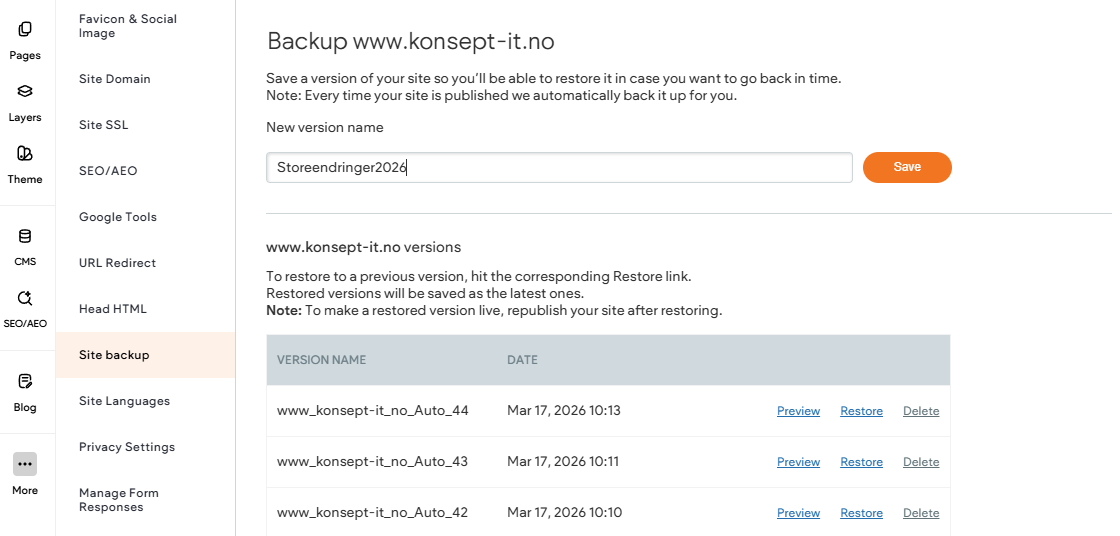 Gå til "...", deretter "Settings" og trykk på "Site backup". Her kan du enkelt trykke "Preview" for å se en tidligere versjon av nettsiden, samt trykke "Restore" dersom du ønsker å gå tilbake til forrige versjon. Skal du gjøre en rekke endringer, kan det være lurt å ta en backup manuelt før du starter også. Da har du et satt punkt du kan gå tilbake til dersom du ønsker å teste og leke litt i editoren med ny funksjonalitet.